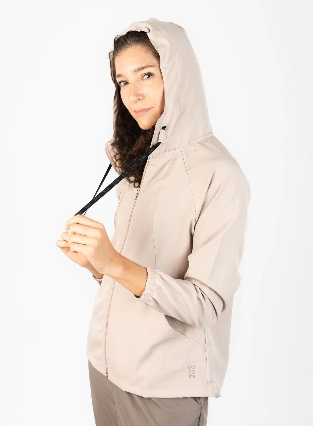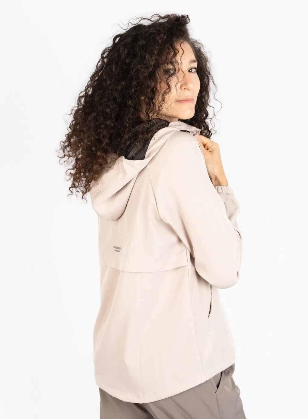 Calce semi entallado, con largo modular mas pronunciado en la espalda, cuello alto con capucha forrada en tela red y detalle de diseño por donde pasan los cordones.