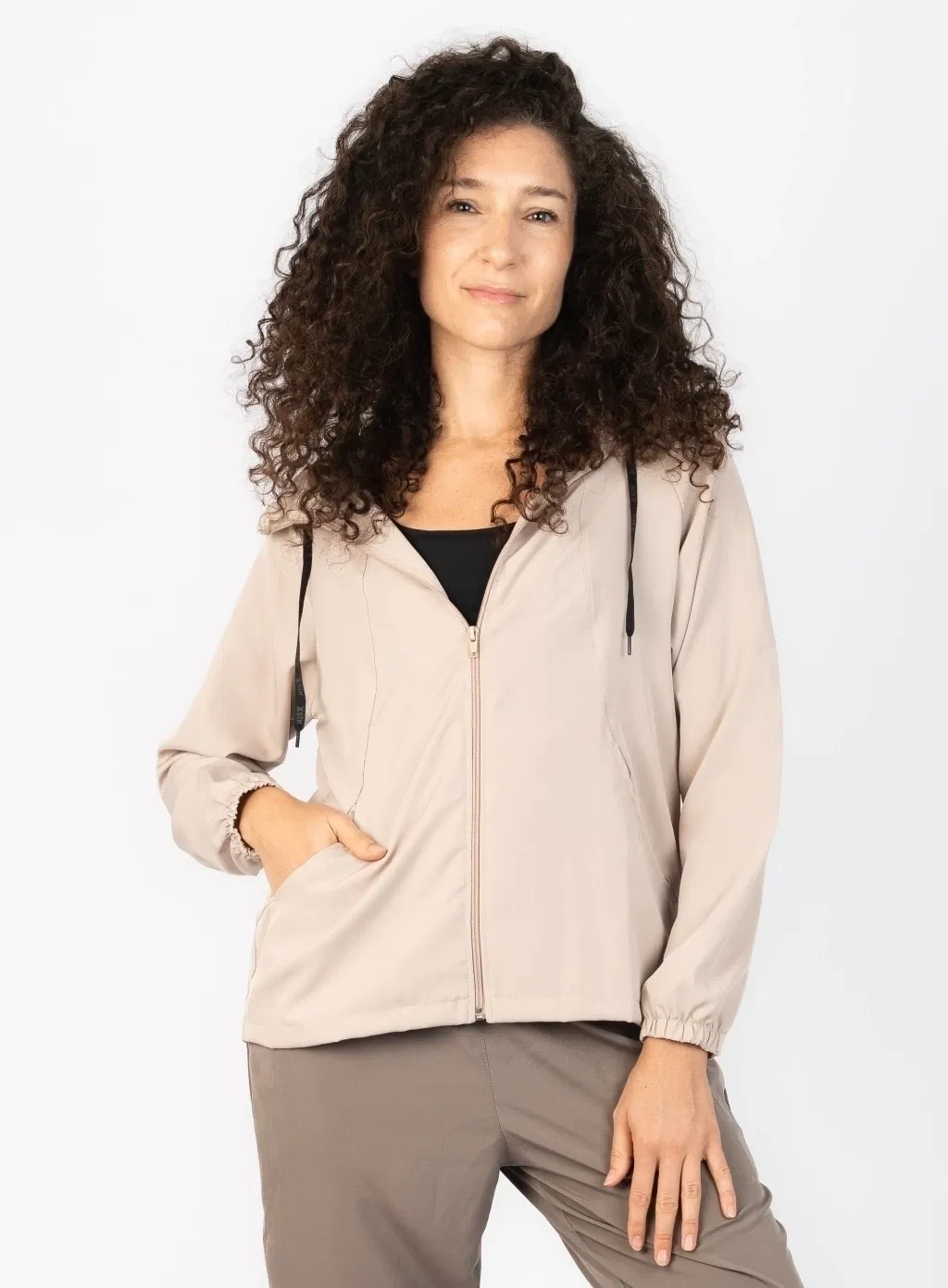 Campera confeccionada en Microfibra Elastizada, material ultra liviano, flexible y de secado rápido.