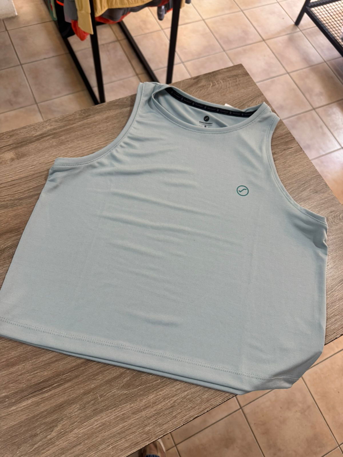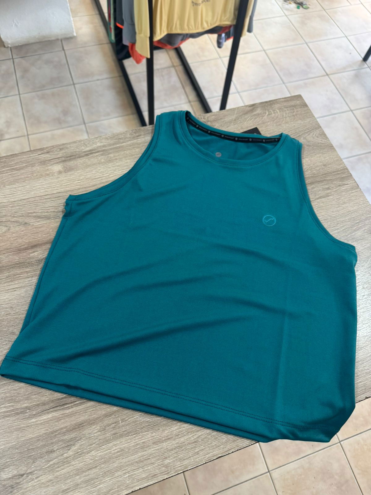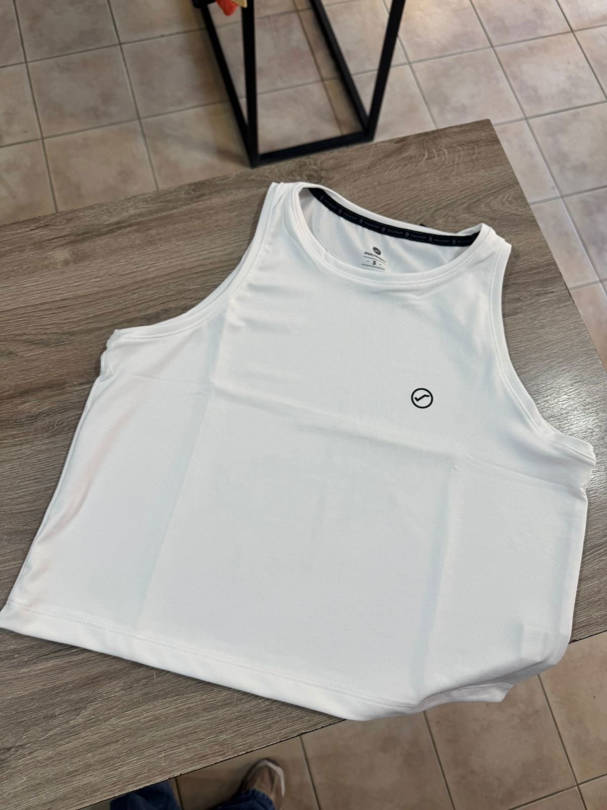 Una musculosa super versatil, su tela es lycra y su corte es corto y bien anchito.