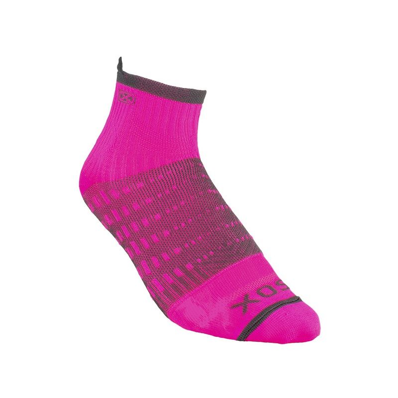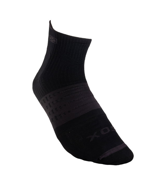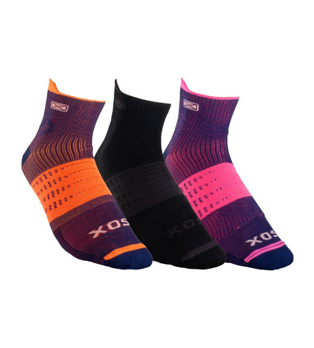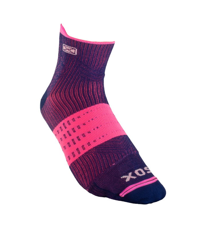 Medias para running con media interna de microfibra incorporada que expulsa la humedad hacia el exterior y reduce el rozamiento del pie con el calzado para evitar la aparición de ampollas. Media externa con tecnología de compresión para contribuir a la re-circulación del sistema sanguíneo y a la contención de los músculos del pie. Colaboran en la prevención de la fascitis plantar por la compresión transmetatarsal. Lengüeta en el puño para mejor calce. Costura de puntera extra plana, talón y puntera reforzados. Secado rápido gracias a su composición.