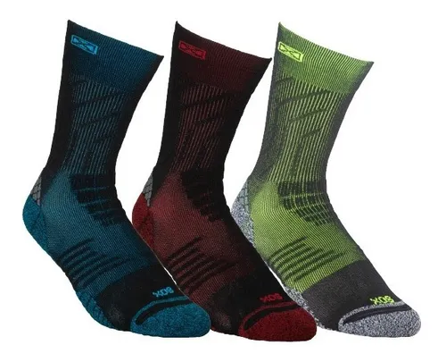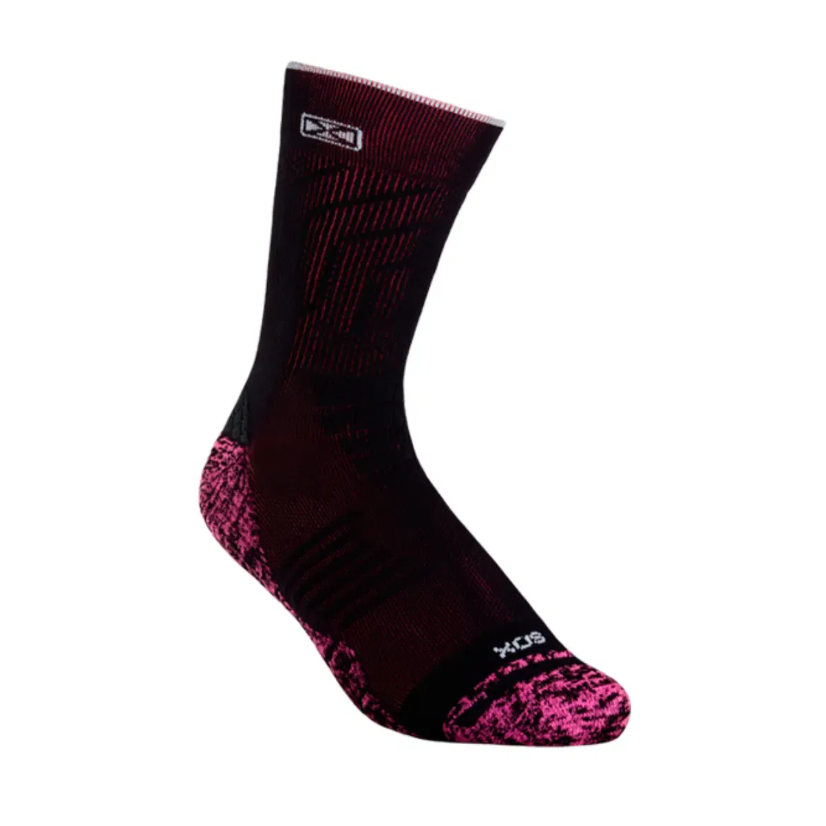 Medias de compresión pensadas para el deportista. Desarrolladas para contribuir a la re-circulación del sistema sanguíneo y a la contención de los músculos. Colaboran en la prevención de la fascitis plantar por la compresión transmetatarsal. Puño doble elastizado, caña y pie anatómicos, puntos de apoyo sectorizados con mayor densidad para absorber impactos. Talón y puntera reforzados, costura de puntera extra plana. Secado rápido gracias a su composición.