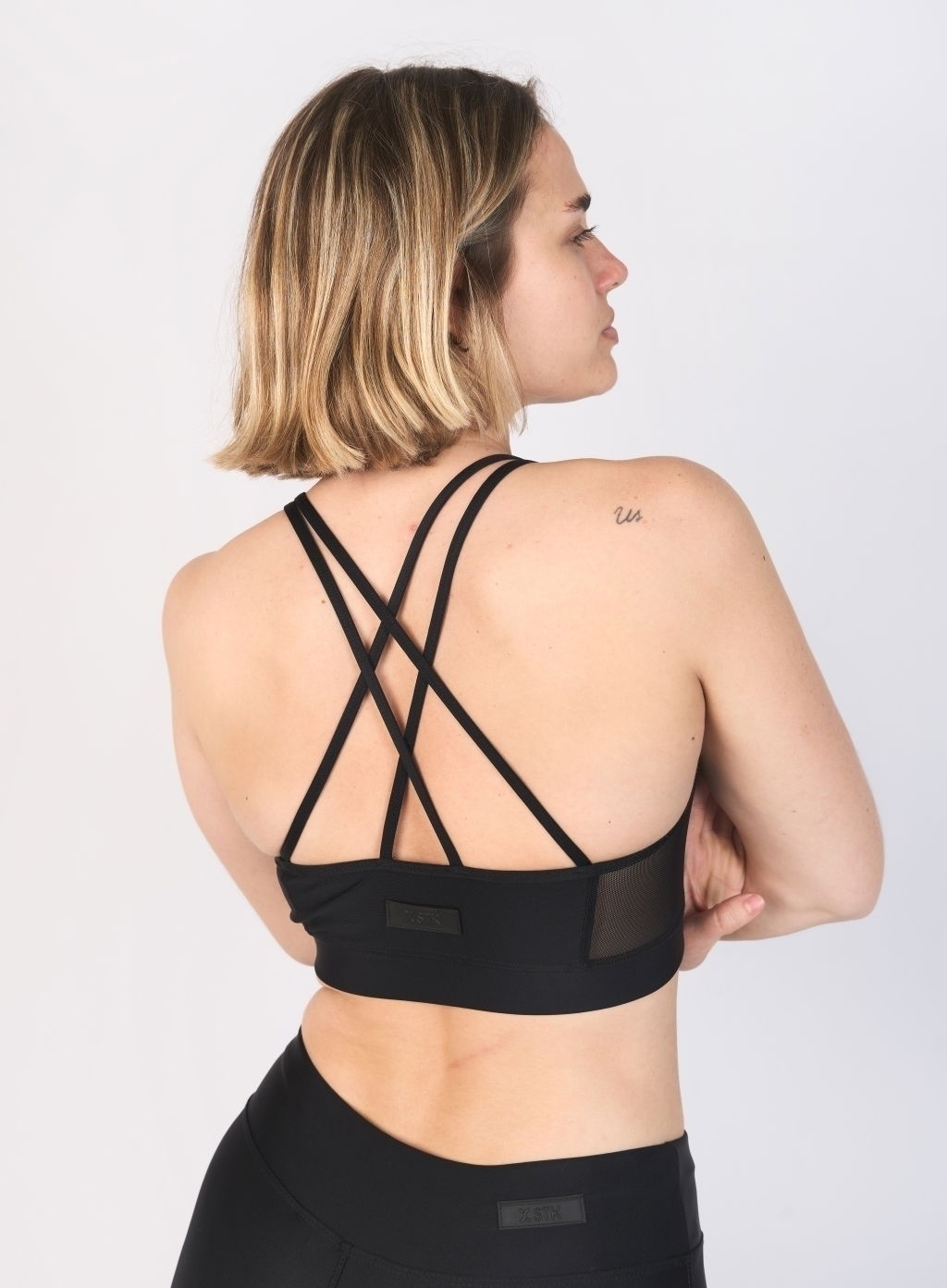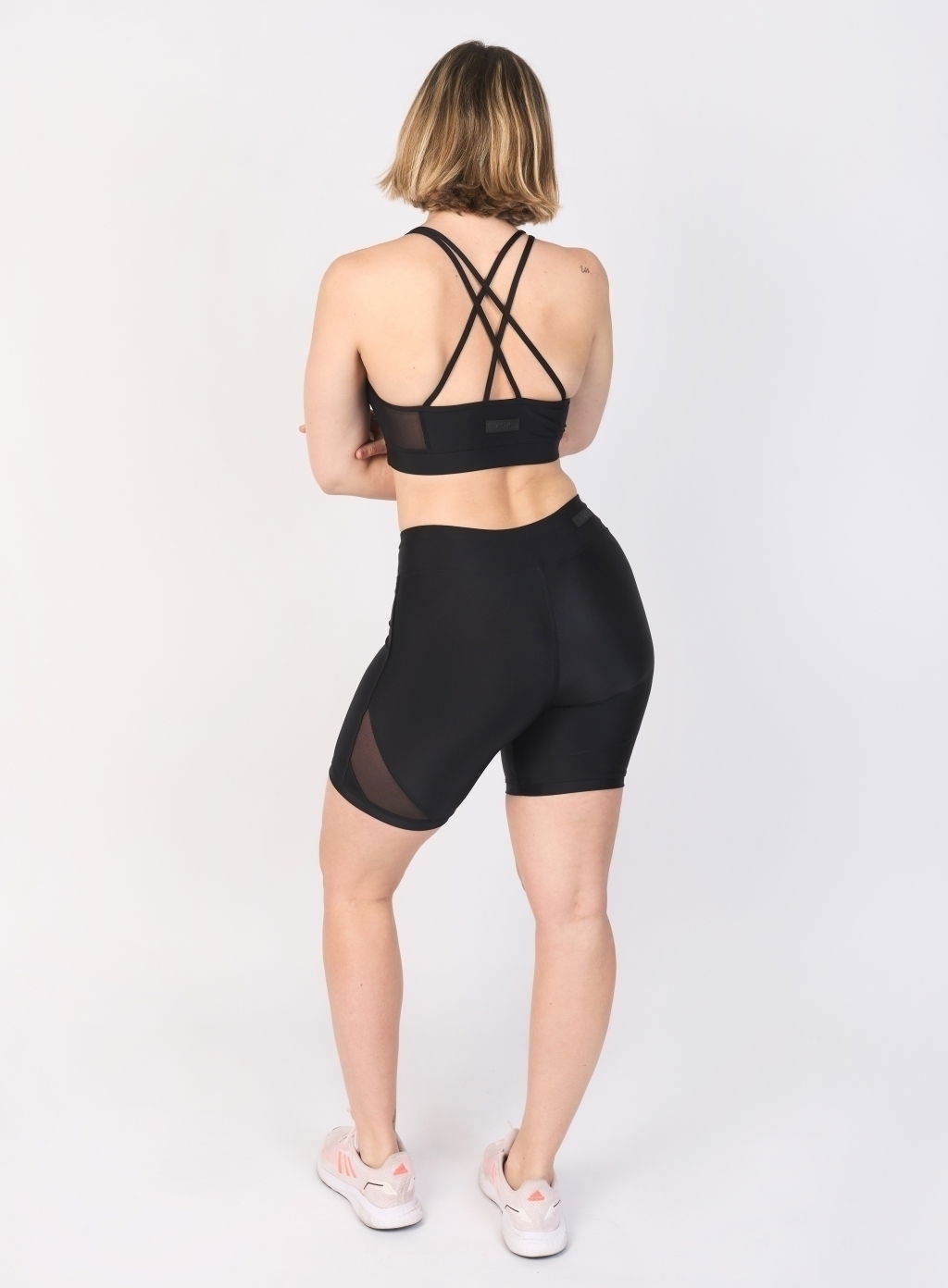 Su diseño incluye elegantes recortes laterales en Powernet que aportan frescura y estilo, mientras que las tiras cruzadas en la espalda realzan la silueta con un toque moderno y sofisticado.