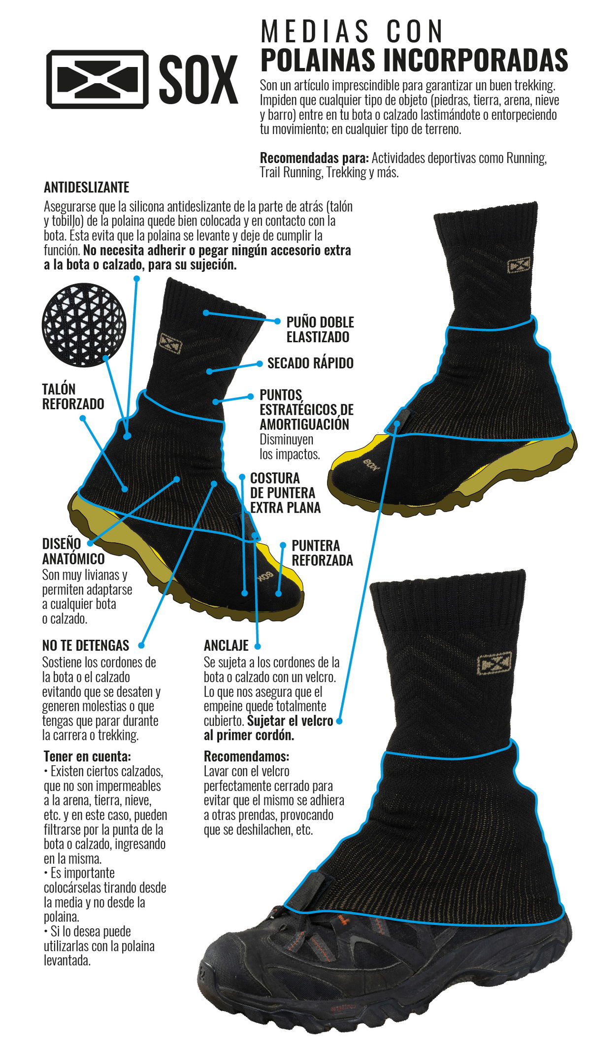 Puño doble elastizado, caña y pie anatómicos. Puntos estratégicos de amortiguación en caña y pie para disminuir los impactos. Costura de puntera extra plana, talón y puntera reforzados. Polaina incorporada, que evita el ingreso de piedras, tierra, arena, nieve y barro a tu bota; en cualquier tipo de terreno. Secado rápido gracias a su composición.
